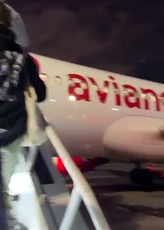 passengers boarding an Avianca airplane at night. The first shot is from behind, looking up the stairs toward the entrance of the plane as passengers ascend. The next shot shows the side of the plane, including the Avianca logo, the engine, and the tail. The plane is white with red accents. There are orange cones near the plane, and a vehicle attached to the plane near the engine. The background shows a dark night sky.