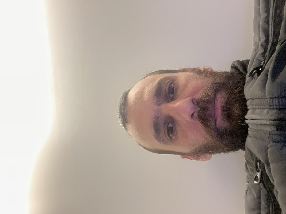 The scene is located in Etterbeek, Belgium. A single adult male is depicted in a close-up, low-angle photograph, occupying the lower half of the frame. The subject has a medium complexion, dark eyes, dark hair, and a full dark beard and mustache. His hair on the scalp is dark and shows a receding hairline. He is wearing a dark grey, likely padded or quilted, zip-up jacket with a visible central zipper and a black zipper pull or clip on the left side of the chest. The subject's gaze is directed forward, specifically into the camera lens. The background consists of a plain, light-colored wall or ceiling, with a brighter, less distinct area in the upper portion, suggesting an overhead light source or bright ceiling. The environment appears to be indoors. No actions or interactions beyond the subject's direct gaze are evident.