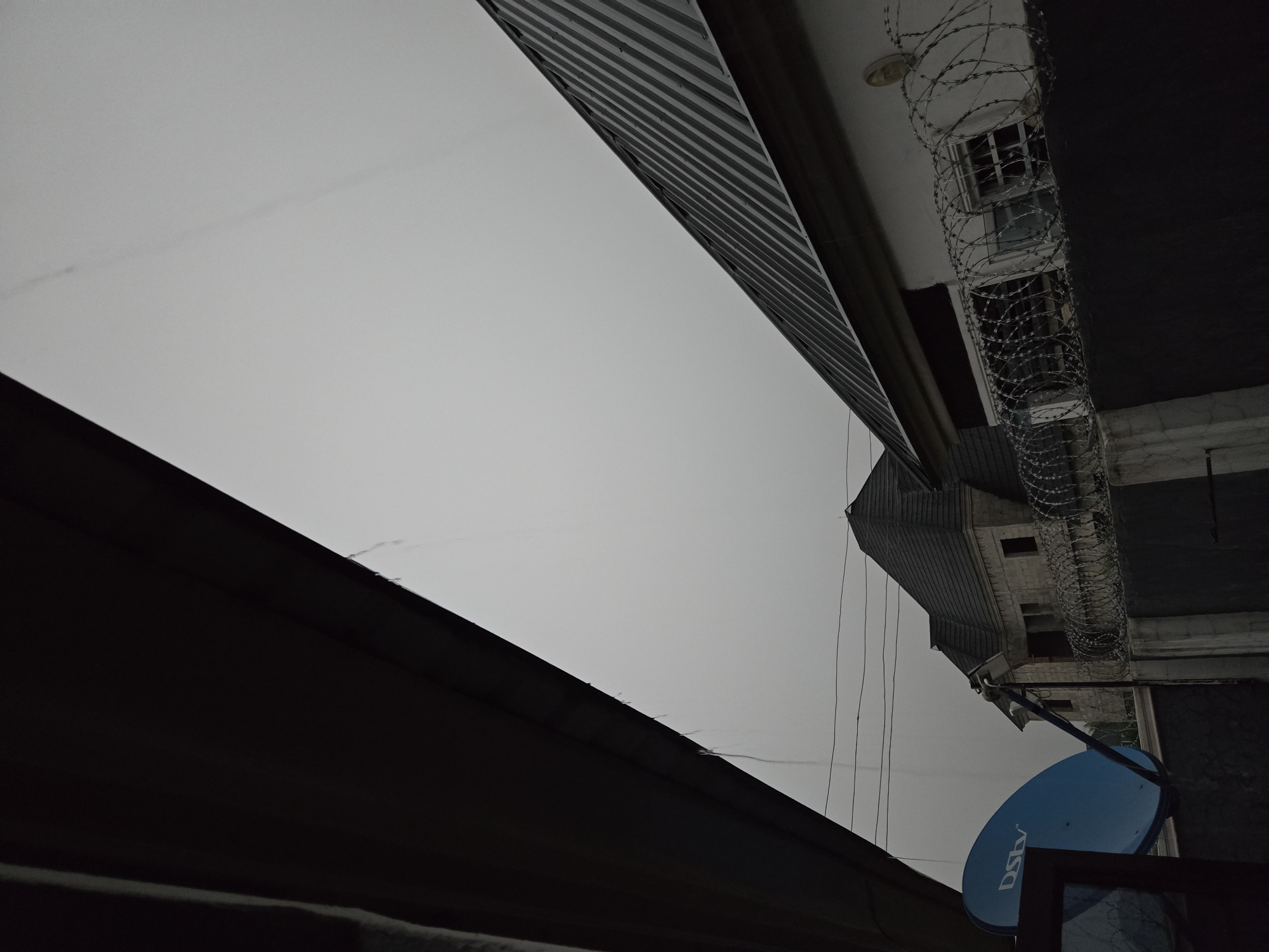 The image, taken from a low angle in Abraka, Nigeria, shows a gray sky above structures and objects