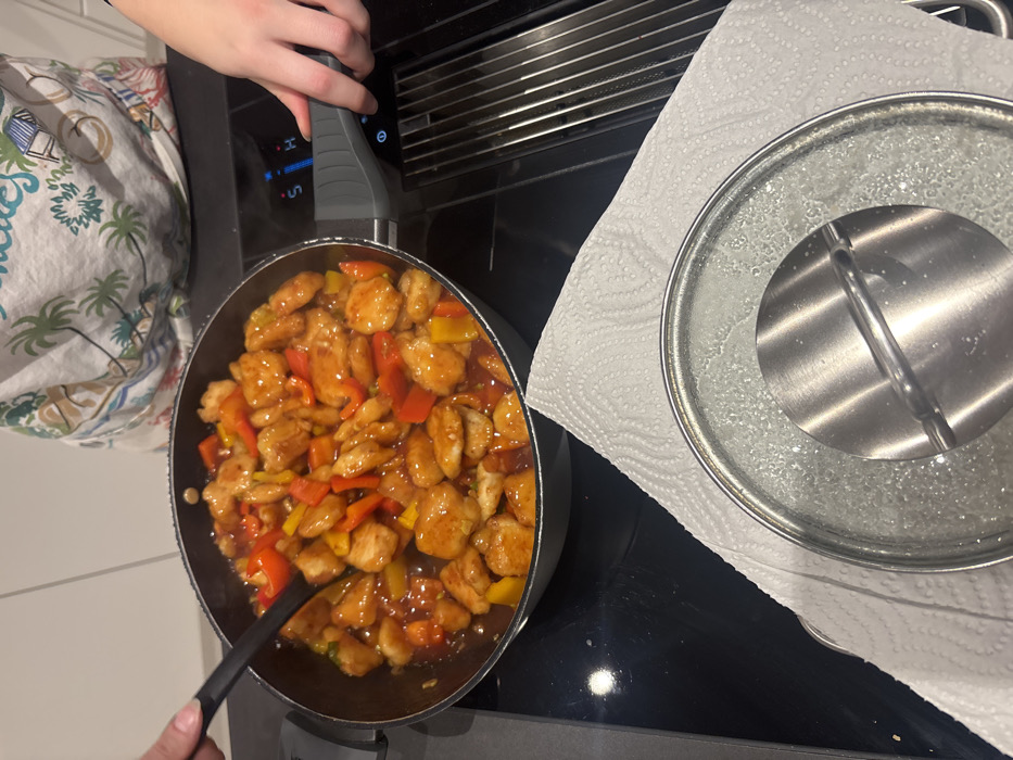 - "A frying pan containing a mix of diced chicken and red and yellow bell peppers in a sauce sits on a black stovetop" by FM-pXvC72, licensed under CC BY 4.0