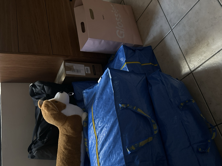The image displays an indoor scene located in Zapopan, Mexico, specifically a corner of a room or storage area. The floor consists of light-colored square tiles with dark grout lines. On the left side, a large, brown and white stuffed dog is positioned on top of a stack of three large, blue IKEA FRAKTA storage bags. The top IKEA bag features a yellow zipper and visible IKEA branding on its yellow straps. Behind the stuffed dog and the top IKEA bag, a black duffel bag is partially visible. Adjacent to the stack of IKEA bags, a plain cardboard shipping box with visible labels leans against a wooden dresser or cabinet, which occupies the right portion of the background. To the right of the IKEA bags and in front of the dresser, a light pink paper shopping bag from "Glossier" with "DEANES" printed above the main logo stands upright on the tiled floor. No people are present.