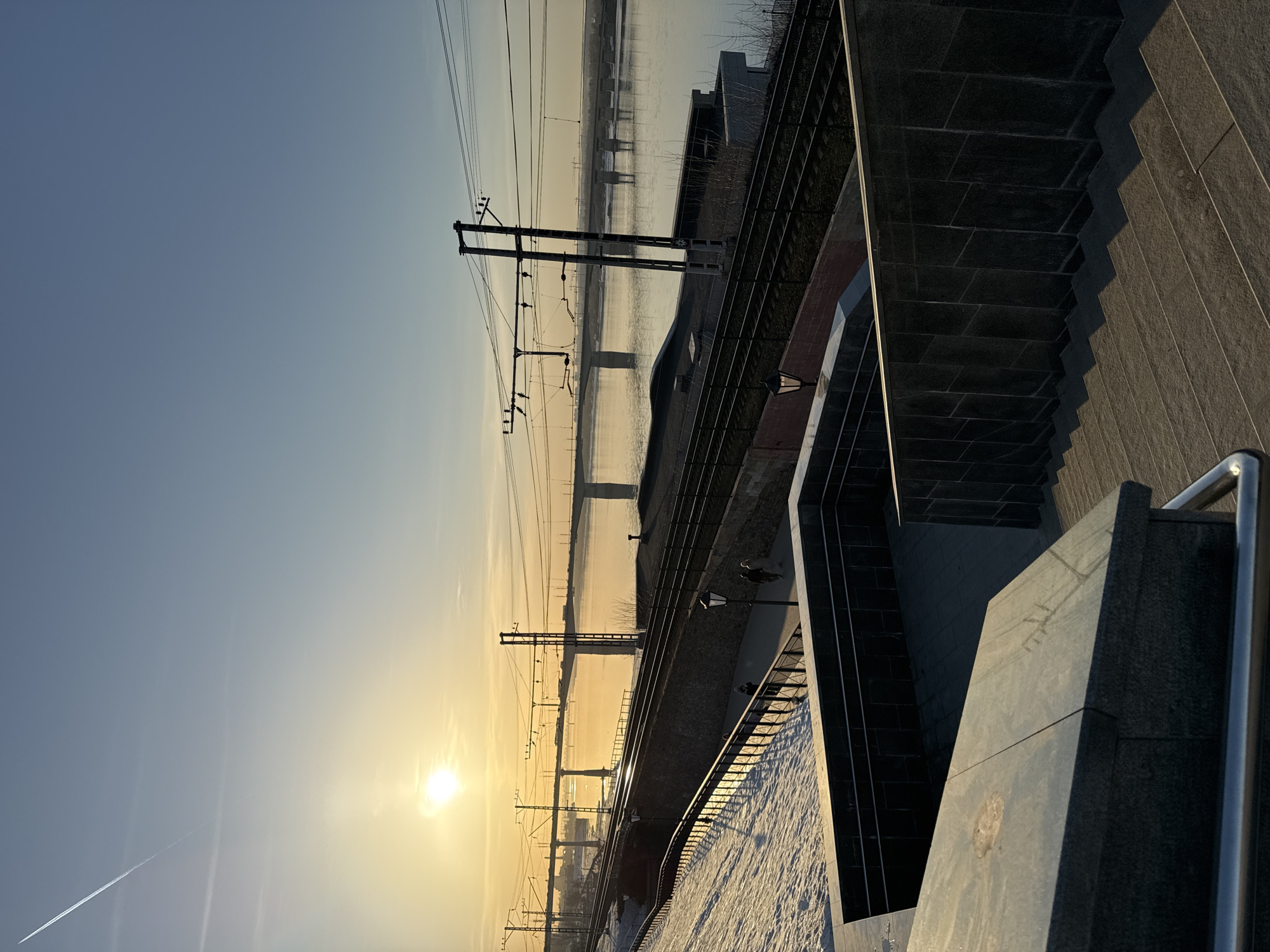 A landscape view in Perm, Russia shows a railroad line running parallel to the Kama River under a sky transitioning from blue to yellow due to the sun. Power lines are visible alongside the tracks. A set of stairs and stone embankment are at the right. Snow covers the ground along the riverbank. An airplane contrail appears in the sky.