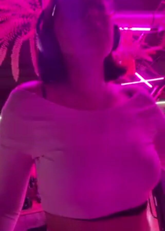 A woman is standing under a neon-lit palm tree, wearing headphones, glasses, and a white long-sleeved off-the-shoulder top with black bottoms. The lighting is primarily pink. She appears to be looking down at something in front of her.