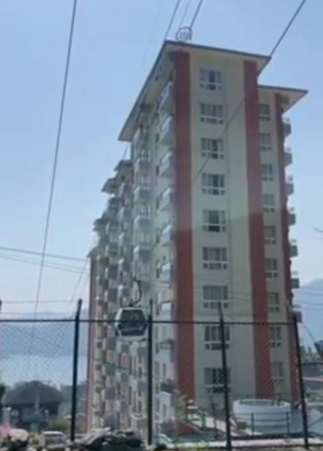 cable car moving along a cable in front of a tall apartment building. The building is light tan with red vertical stripes and has balconies on each floor. There is a chain link fence at the bottom of the frame, with some greenery in front of it. In the background, there is a view of a lake and mountains. The sky is clear and blue.