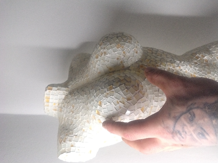 A close-up depicts a mosaic-tiled sculpture resembling a woman's bust. The sculpture is predominantly white with subtle yellow variations in the mosaic. A hand with tattoos obscures part of the sculpture, with the index and middle fingers lightly touching the mosaic surface. The background is a plain, off-white wall or surface, providing a stark contrast that emphasizes the intricate texture of the mosaic and the hand's presence.