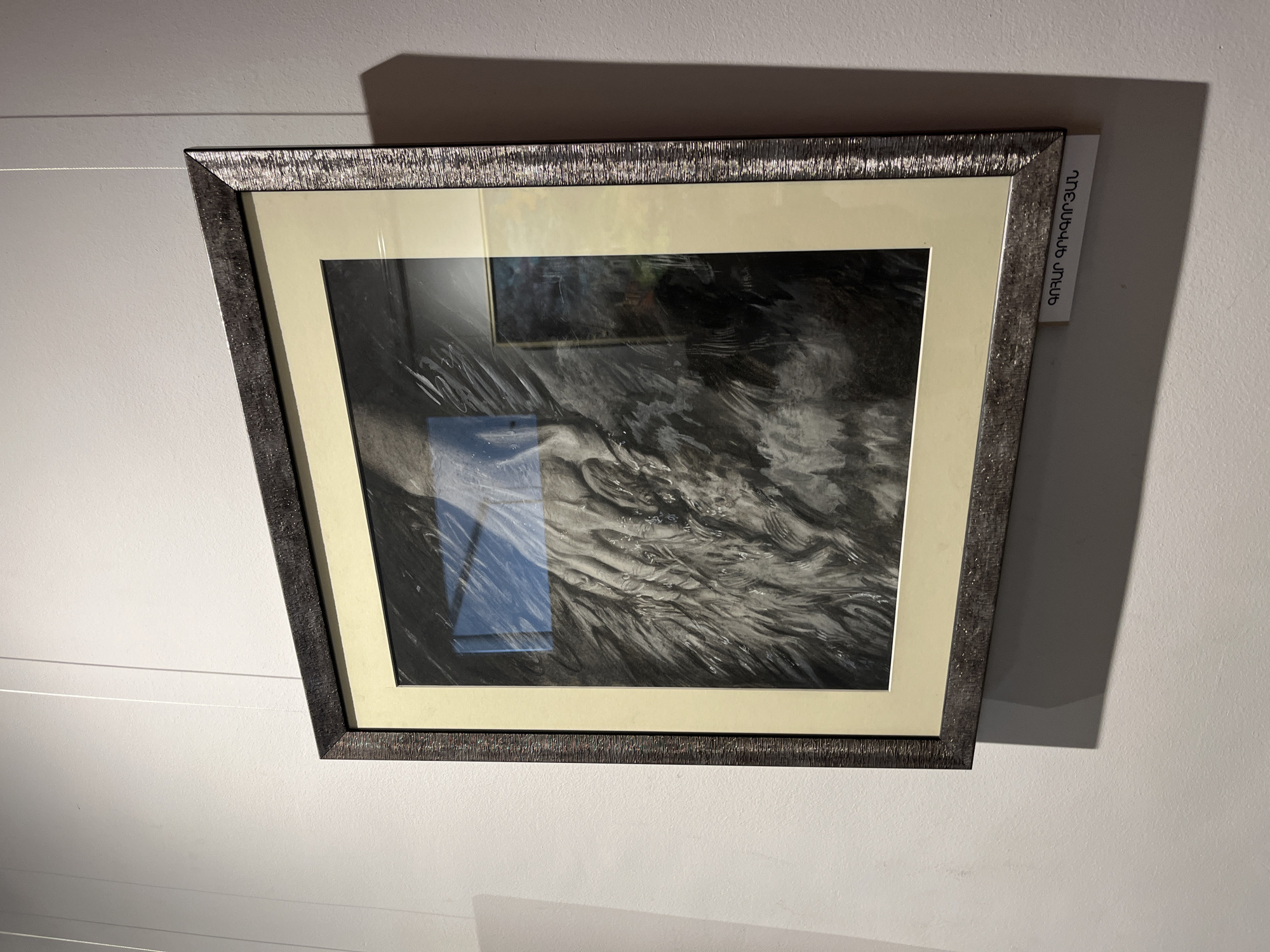 A framed, grayscale artwork depicting what appears to be an abstract representation of turbulent water hangs on a light gray wall, likely inside a gallery or exhibition space. The frame has a decorative, textured pattern. A small white label with vertical Armenian script is attached to the upper right corner of the frame. A thin, horizontal wire suggests that the artwork is suspended from a hanging system. Based on the provided information this artwork is probably located in the city of Yerevan, Armenia.