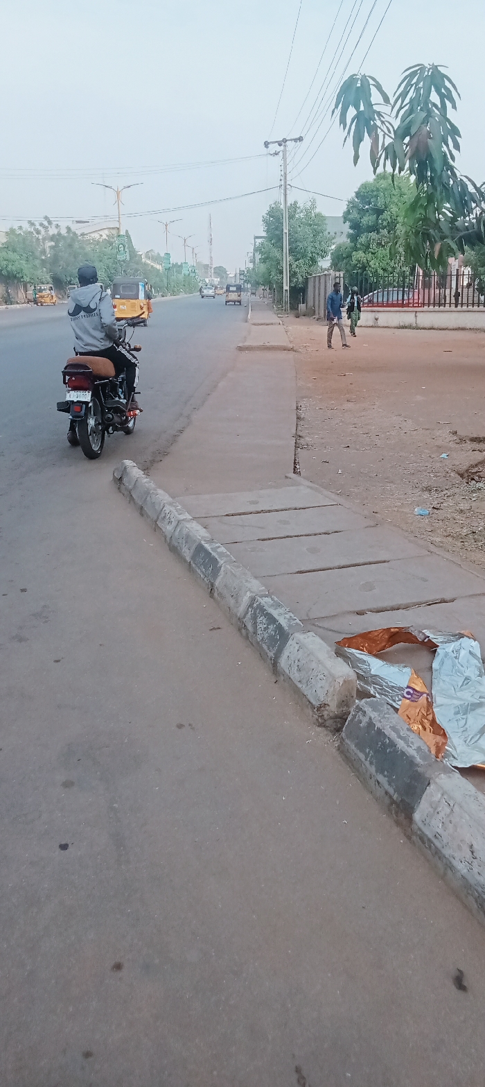 A street scene shows a person on a small motorcycle on the left side of the road. A sidewalk runs along the right, with two pedestrians walking on it. In the distance, there are three-wheeled auto rickshaws and other vehicles on the road. Trash is visible on the side of the road in the foreground. The sky is overcast and utility poles line the street. Trees are visible on the right side of the road.