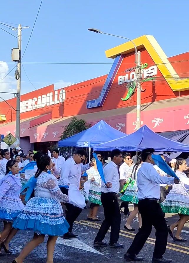 A group of people, mostly men in white shirts and dark pants and women in blue and white dresses, are dancing in the street. They appear to be part of a parade or celebration. The women's dresses have frills and lace, and they hold white cloths in their hands. Behind the dancers is a large red building with "MERCADILLO BOLONESI" written on it in white letters. Several blue tents are set up in front of the building. The sky is bright blue and clear. There are power lines and street lights visible overhead. The people are smiling and seem to be enjoying themselves.