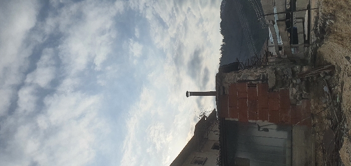 The image displays an outdoor scene in Rudozem, Bulgaria. The sky is partly cloudy, featuring a mix of white and grey stratocumulus clouds. In the midground, a building or structure is observed in a state of partial demolition or disrepair, exposing a foundation of rough stone and concrete, topped by sections of unfinished red brickwork. A dark, cylindrical metal chimney pipe, capped at its apex, extends vertically from this structure, slightly right of center. To the far left, a portion of an older building with a dark-tiled roof is visible, with a section of corrugated metal sheeting below. The ground in the immediate foreground and around the base of the structure consists of loose soil and construction debris. To the right, a dirt path or road is present, partially obstructed by a crude wooden fence. A light-colored vehicle is partially visible behind the fence, and multiple dark electrical or communication cables span horizontally across the midground. The background features green, forested mountains or hills extending towards the horizon. No individuals are depicted in the scene.