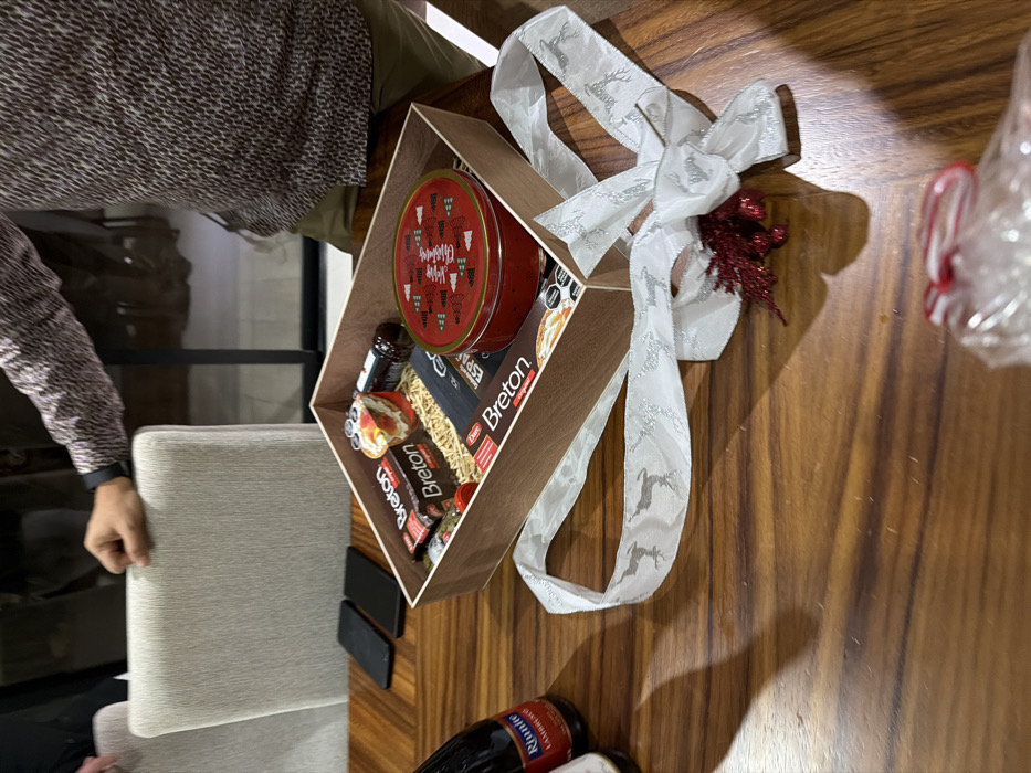 A wooden box filled with snacks and treats sits on a wooden table. Inside are crackers from the brand "Breton," a small jar of something, and a red tin with white Christmas tree decorations. A white ribbon with silver reindeer adorns the box, along with a red, sparkling decorative piece. A bottle of Lambrusco wine is partially visible near the bottom, and some wrapped candies rest to the right of the box. The corner of a chair and a person's arm are also visible in the frame.