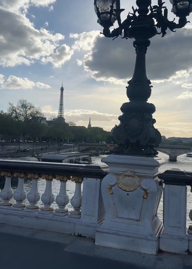 view of the Eiffel Tower in Paris, France, from a bridge over the Seine River. The foreground features a white and gold ornate bridge railing and a decorative lamppost. The Eiffel Tower is visible in the distance against a cloudy sky with the sun shining through. A person stands near the railing looking out at the view. The river flows beneath several bridges in the distance. Trees line the riverbank. The scene appears to be taken during the late afternoon or early evening due to the position of the sun.