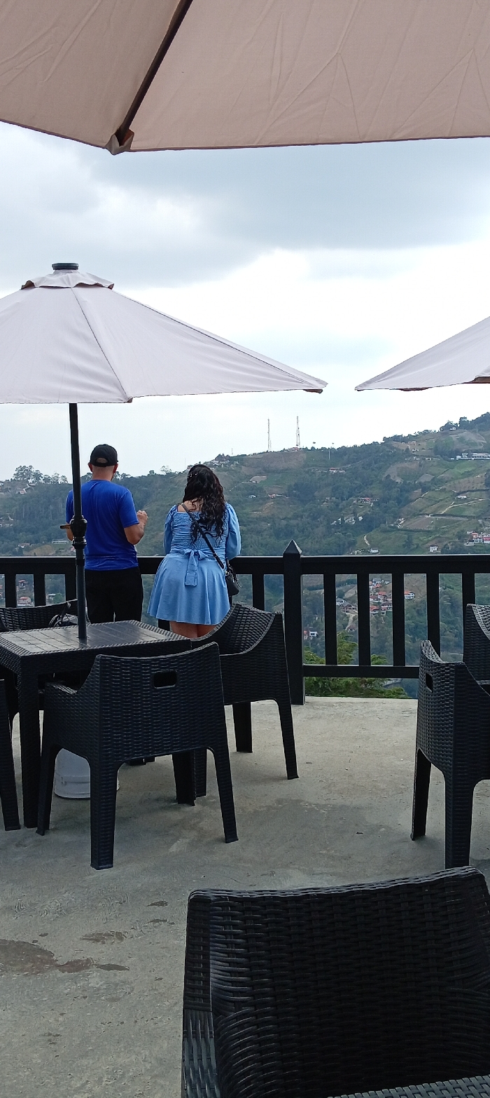 An outdoor terrace in Colonia Tovar, Venezuela, is depicted under an overcast sky, offering a panoramic view of a mountainous landscape. Two individuals are positioned with their backs to the camera, standing at a dark-colored railing and observing the distant scenery. The individual on the left is a male wearing a blue short-sleeved shirt and a dark baseball cap; his right hand appears to hold a small, unidentifiable item. The individual on the right is a female with long, dark, wavy hair, dressed in a light blue, off-the-shoulder dress featuring a tied back. A dark strap from a bag is visible on her right shoulder. The terrace floor is light-colored concrete or paving, displaying faint stains. Multiple dark-colored, woven (wicker-style) outdoor tables and chairs are arranged on the terrace. At least two large, light-colored patio umbrellas are open, with one prominently positioned on the left covering a table and chairs. The background reveals undulating green hillsides covered with vegetation, numerous scattered residential buildings, and two tall, mast-like structures on a distant peak.