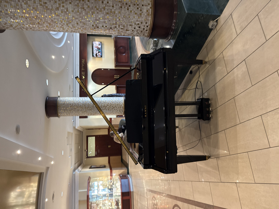The scene is an indoor public area, potentially a hotel lobby or lounge