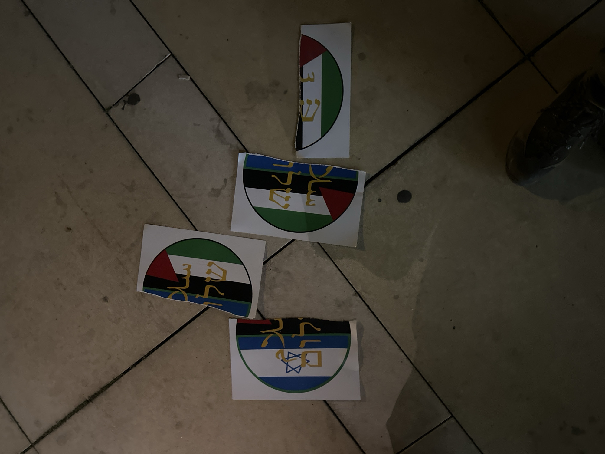 On a tiled surface, possibly a sidewalk, there are four scattered paper stickers. Three of the stickers are semi-circular, with variations combining the Palestinian flag with elements associated with Israel, like the Star of David. The Hebrew word "Shalom" is overlaid on all the stickers. One sticker is a torn rectangle with a similar combination of the Palestinian flag and the word "Shalom" in Hebrew. To the upper right corner of the image, there is a black shoe. The location is implied to be in Tel-Aviv, Israel.