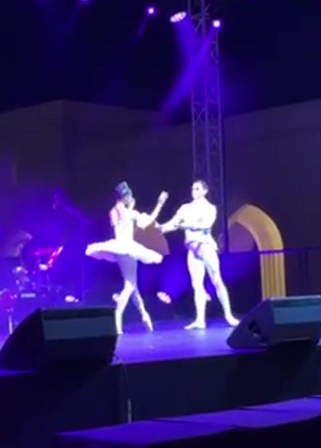 Two ballet dancers perform on a stage lit with purple lights. The female dancer wears a white tutu and the male dancer is in a white and silver costume. They are holding hands and performing a pas de deux. A band is partially visible behind them. Behind the stage is a building with arched openings and a metal lighting structure. The stage is flanked by large black speakers.