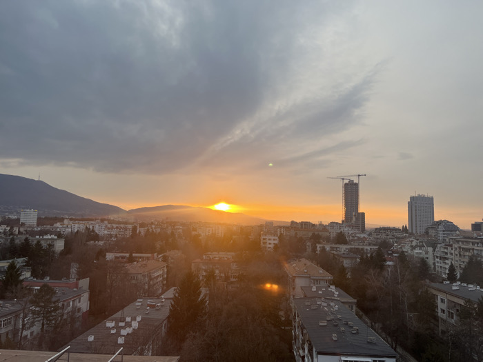 - "An aerial view captures a sunrise over the city of Sofia, Bulgaria, from a high vantage point looking generally southeast towards the Mladost district" by FM-TV8UE3, licensed under CC BY 4.0