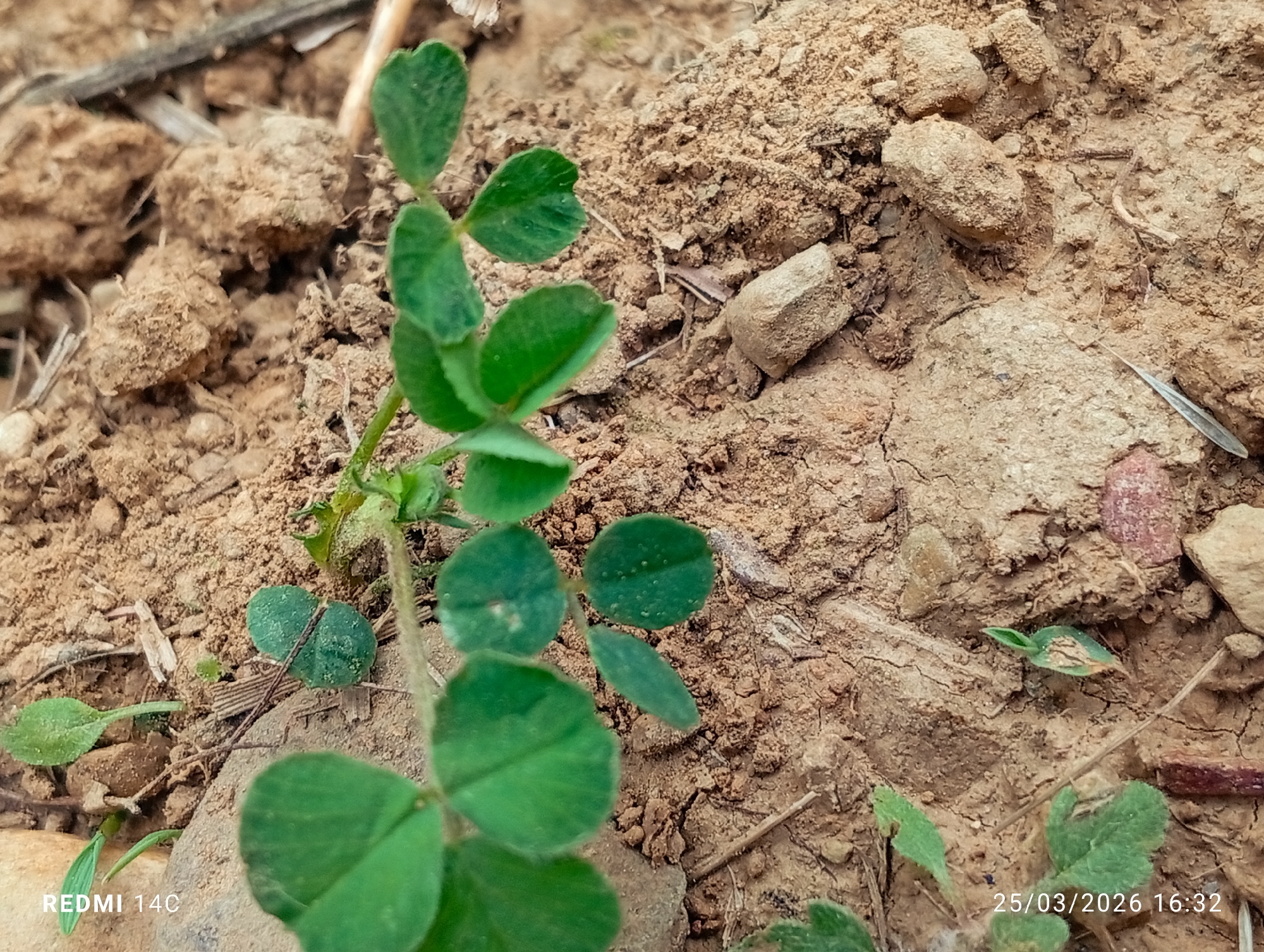 The image displays a close-up, overhead view of a small green plant growing from dry, compacted brown earth in Grhala, Pakistan. The central plant features a thin stem and multiple small, obovate to rounded green leaves, some appearing slightly dusty or textured. The surrounding ground consists of uneven soil, characterized by numerous dry clumps, small cracks, and scattered light brown to grey pebbles and stones. Interspersed throughout the soil are fragments of dry organic debris, including small twigs and plant matter. Additional smaller, less developed green shoots are visible in various parts of the frame, indicating sparse growth. The lighting suggests natural daylight. A digital watermark in the lower left corner reads "REDMI 14C," and a timestamp in the lower right corner displays "25/03/2026 16:32." No individuals are present in the scene.