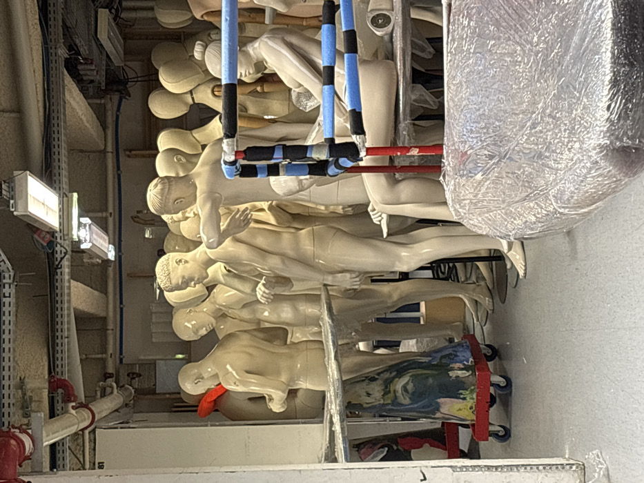 The image displays an interior industrial-style storage or workshop area. The ceiling features exposed red pipes, blue conduits, and multiple fluorescent light fixtures. A vertical white column on the left is marked with the number "81". The floor is light grey. The primary subjects are numerous, nude, flesh-toned mannequins of various genders and poses, densely packed throughout the space. Several standing male mannequins are visible in the mid-ground, one with a modern haircut, and another on the far left partially obscured by a red, draped object. A seated female mannequin, also nude, is positioned on a shelf or table in the foreground, partially behind a structure composed of red poles wrapped with blue and black striped padding. Further back, additional headless or partially disassembled mannequins are visible. A multi-colored, abstract conical object rests on a red wheeled cart with blue casters on the left. Various items, including what appears to be part of a display or furniture, are wrapped in clear plastic sheeting in the foreground. The environment indicates a facility for handling commercial display mannequins. The precise location within Paris, France, is not discernible from the visual information provided.