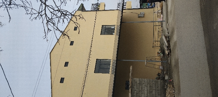 This image depicts a two-story building in Aktash, Uzbekistan, under an overcast sky. The building's facade is light beige. The upper story features a sloped roofline on the left and several small, dark, rectangular openings near the top. Two prominent dark-framed windows are present on the upper story, along with a small, dark-railed balcony on the far right. The lower story is partially covered by a corrugated metal canopy supported by two grey metal poles. Under the canopy, a partially visible window and a grey electrical box are affixed to the wall. The foreground consists of an asphalt road surface. Adjacent to the building, on the left, is a partially constructed cinder block wall with accumulated dirt and debris at its base. A metal A-frame structure and scattered construction materials, including what appears to be a broken wooden pallet, are visible on the ground. A low, dark metal railing extends along the ground level to the right. A single individual, dressed in dark clothing, is partially visible on the far right, standing on the sidewalk near the building. Overhead, two dark utility lines span the scene against the pale grey sky, with bare tree branches encroaching from the right.