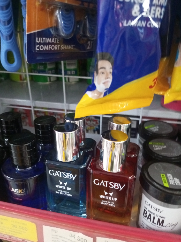 store shelf stocked with grooming products. On the left, "Agio Homme" cologne in a dark blue bottle is displayed. Next to it are two "Gatsby White Up" colognes in light blue ("Sky Reflection") and amber ("Blanc Wood") bottles. Jars of "Gatsby" styling balm and "French Crop" hair product are also visible on the right. Above these items are packages of razors, one labeled "Ultimate Comfort Shave". Price tags are present, displaying "Rp 36.500" and "Rp 34.500".