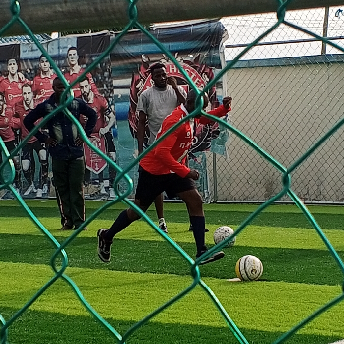 A scene on an artificial turf football pitch in Ohoro, Nigeria, is observed through a green chain-link fence