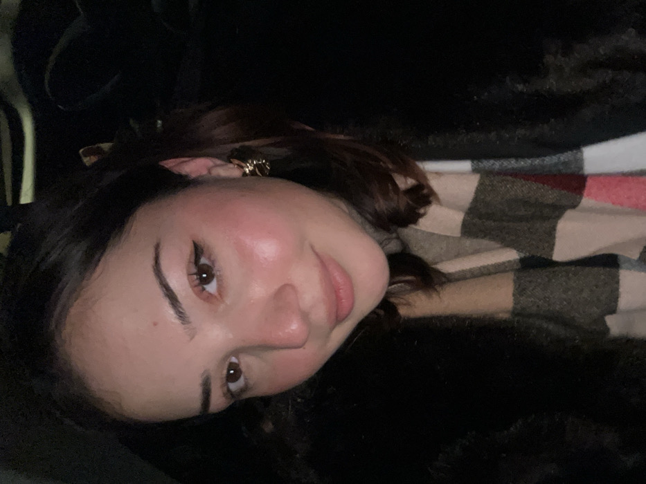 A young woman with dark hair and brown eyes is smiling softly at the camera. She has blushed cheeks, winged eyeliner, and a small gold earring. She is wrapped in a plaid blanket or scarf with beige, brown, and red tones. The background is dark, with the suggestion of a vehicle interior visible on the left. The picture is taken at an angle, with the woman's face tilted towards the viewer.