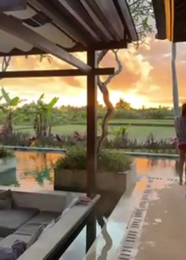A short video shows a sunset over a rice field and a swimming pool