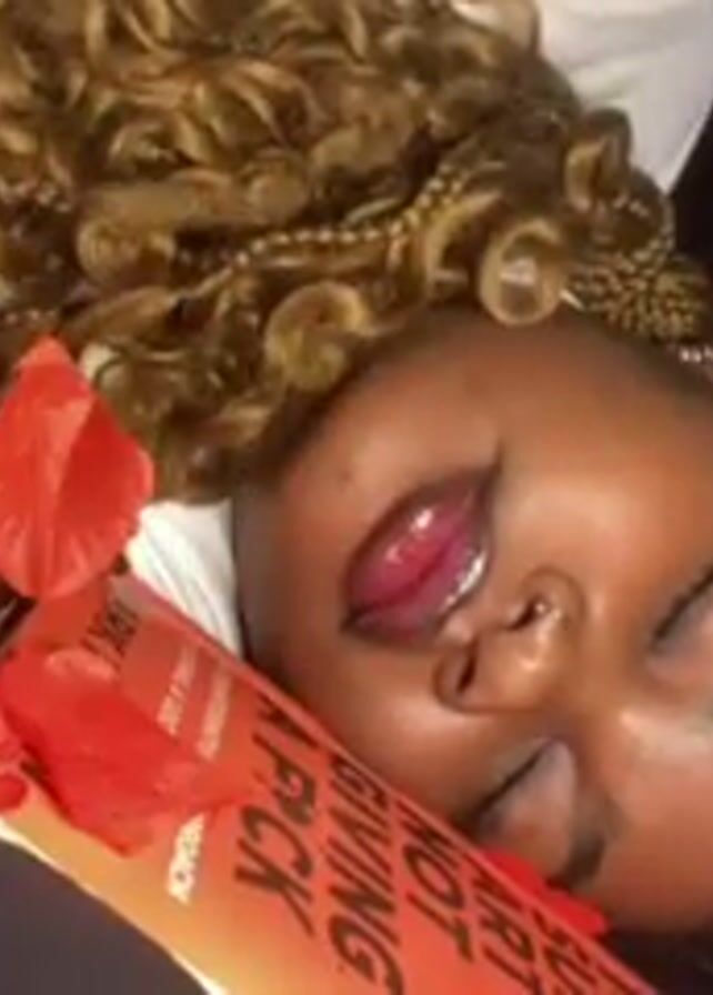 A young woman with curly brown and blonde hair with beaded braids sleeps on her back