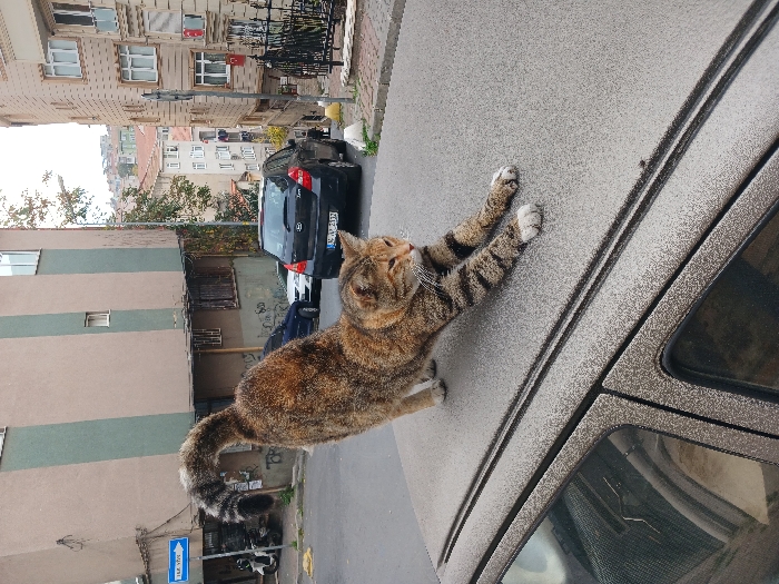 - "A domestic cat, exhibiting a calico/tabby pattern of brown, black, and orange fur, is captured mid-stretch on the light grey, textured roof of a parked car" by FM-kK8AI3, licensed under CC BY 4.0