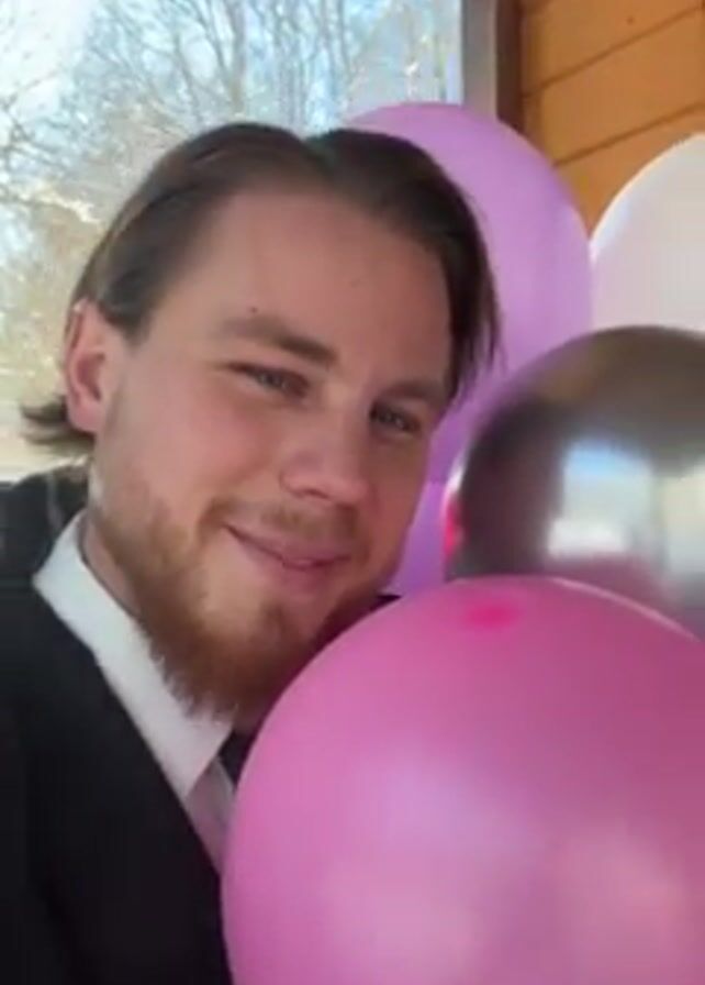 A man stands outside a building, holding a bunch of balloons. The balloons are pink, purple, white, and silver. The man is smiling. He has brown hair and a beard. He is wearing a black suit and a white shirt with a tie. The building has wooden siding and a brown door. There is snow on the ground and trees in the background. The sky is visible.