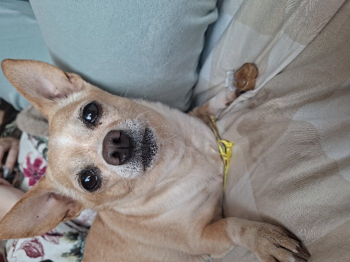 - "A small, light tan Chihuahua-type dog rests on light brown, textured bedding" by FM-YQydj1, licensed under CC BY 4.0