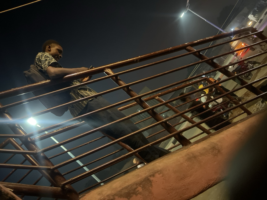 A low-angle shot shows a man standing on a metal pedestrian bridge at night. He wears a patterned shirt, dark pants, and a backpack, and is looking at a phone in his hands. A street and motorcycles are visible through the metal structure below. Street lights and some other signs are seen in the background. The image has a slightly tilted perspective, adding a dynamic feel.
