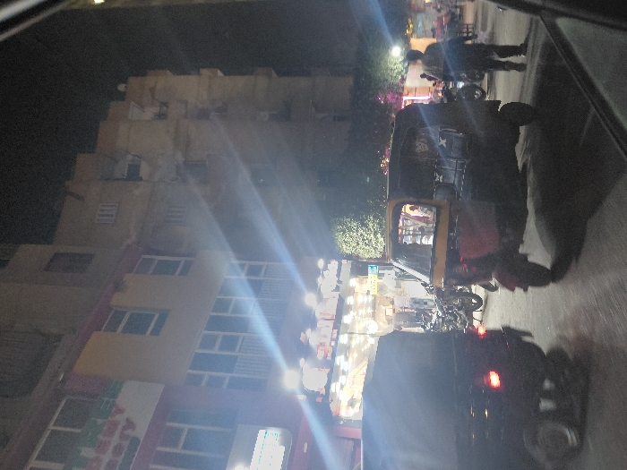 A street scene at night features two auto rickshaws, with parked motorcycles nearby. Buildings with multiple windows are visible in the background. The lighting is bright in some areas, creating glare. Pedestrians walk near the vehicles. The view appears to be from inside a car, with part of the car frame visible on the right.