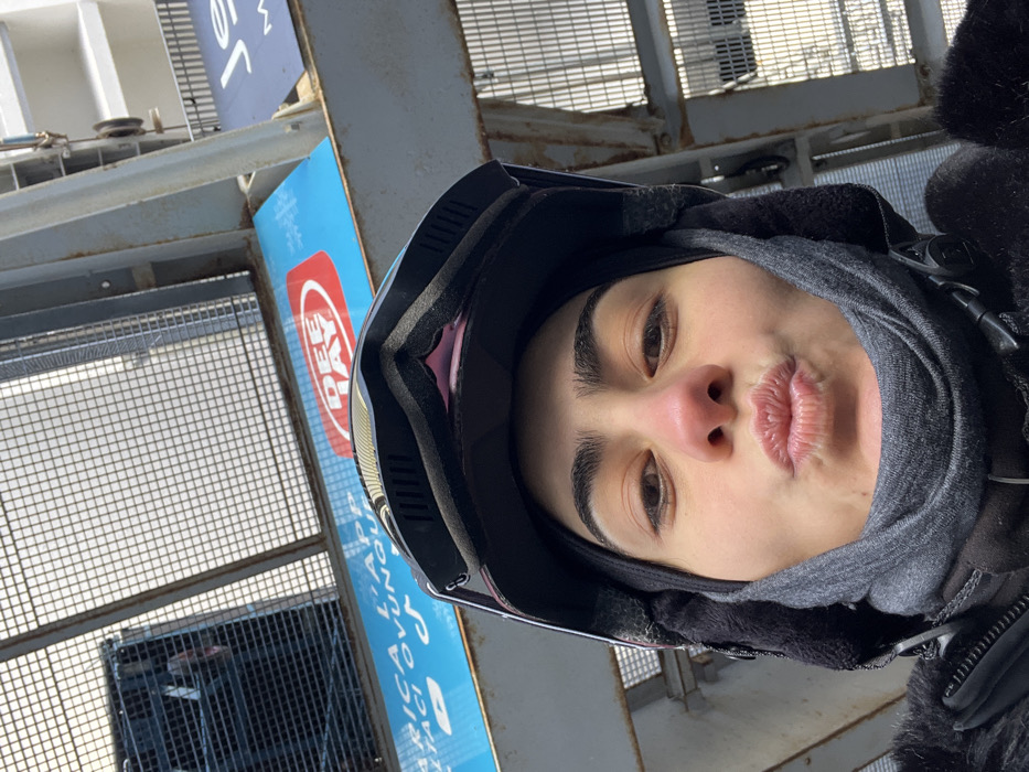 A close-up selfie depicts a woman from the chest up, making a puckered lip expression. She has fair skin, dark eyebrows, and brown eyes, with a slightly reddened nose. She is wearing a black ski helmet with gold-tinted goggles pushed up onto the helmet, a grey balaclava or neck gaiter covering her head and neck, and a black winter jacket with a visible zipper and a furry collar. The background features an overhead grey metal industrial structure, likely part of a ski lift or elevated platform, with visible gridded mesh panels and support beams. A blue sign with a red "DEE JAY" logo and partial white Italian text, including "L'APP" and the TikTok logo, is visible. Another blue sign to the right shows partial white text, "Je." The scene is consistent with a ski resort environment, specifically within the city of Breuil-Cervinia, Italy.