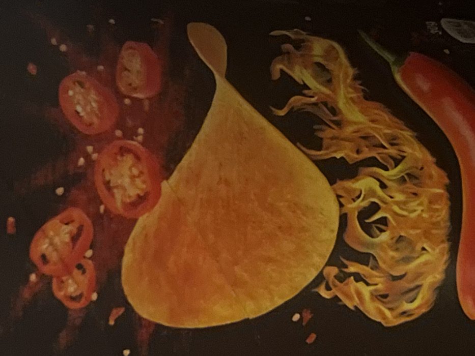 - "A close-up image shows a single potato chip next to sliced red chili peppers, a fiery-shaped graphic, and a whole red chili pepper" by FM-f2iYg1, licensed under CC BY 4.0