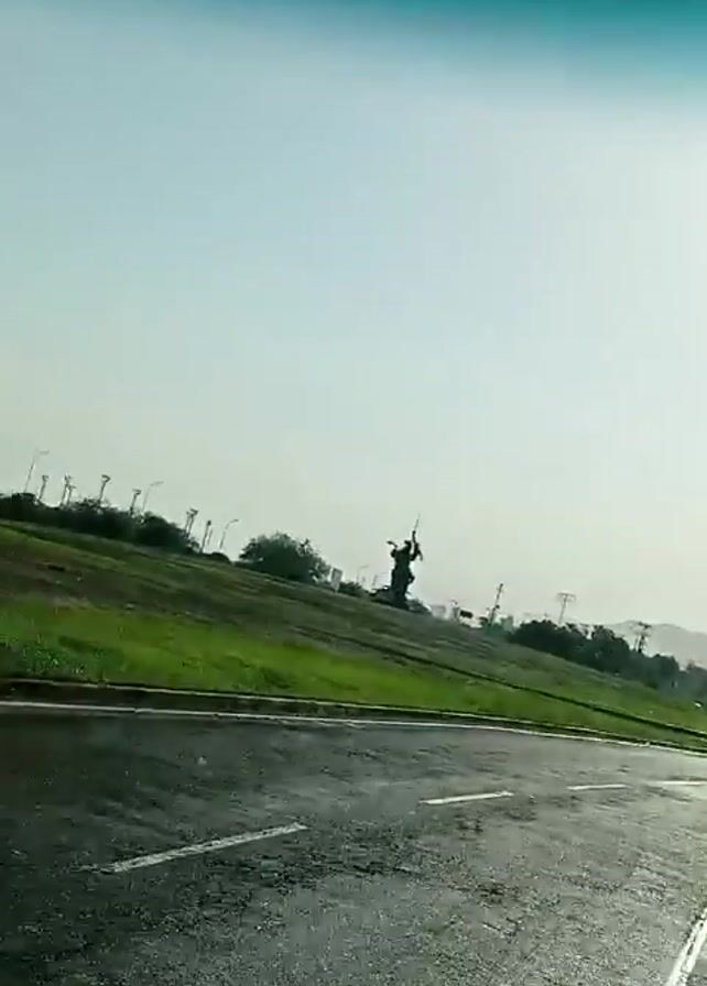 view from inside a car driving alongside a grassy median. On the median is a statue of a man on horseback holding a sword. The statue is backlit and appears dark. There are streetlights, trees, and other buildings in the background. The sky is bright.