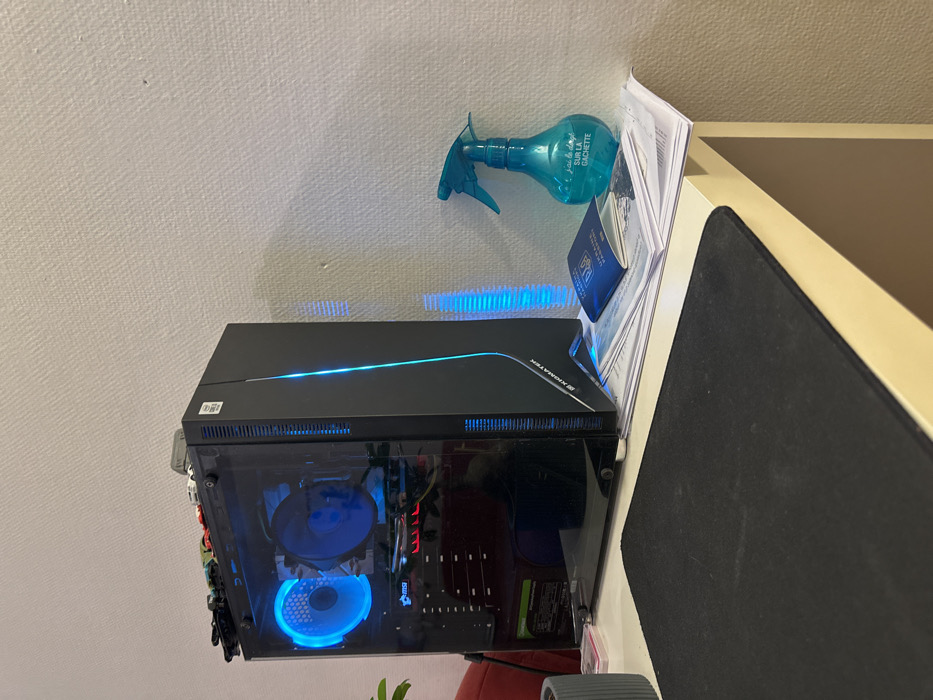 The scene depicts an interior room in Villaz, Switzerland, focusing on a segment of a light-colored desk positioned against a textured, light beige wallpapered wall. A black desktop computer tower, bearing the 'XIGMATEK' brand, stands on the left side of the desk. The PC features a transparent side panel, revealing internal components illuminated by blue LED lights, including a prominent circular fan and an 'MSI' branded graphics card. A vertical blue LED strip also illuminates the PC's front panel. Multiple small, miniature toy vehicles are stacked on the top surface of the PC case. To the right of the PC, atop a stack of white documents, rests an open blue passport with 'УКРАЇНА PASSPORT' visible in yellow text on its cover. Adjacent to the passport is a teal-colored spray bottle with a trigger mechanism, displaying the French text "j'ai vu le loup SUR LA GÂCHETTE" (I saw the wolf on the trigger) on its body. A black rectangular mouse pad occupies the foreground of the desk. Partially visible on the far left is a grey cylindrical pot next to a green plant. A red upholstered object is visible behind the PC on the left. Shadows are cast on the wall, indicating a light source from the left, with blue light patterns reflecting from the PC's illumination.