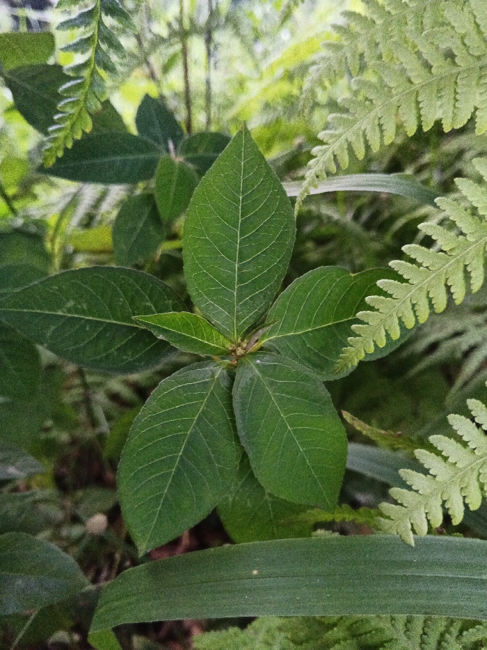 The scene is located in Kyauk Hsoke, Myanmar. The image displays a close-up view of abundant green foliage. A central plant features five ovate green leaves radiating from a central stem structure, each leaf displaying discernible lighter green venation. Multiple light green fern fronds with characteristic pinnate structures are visible on the right side of the frame. Additional green leaves and blurred vegetation populate the background and foreground, creating a dense, natural environment. No human figures, animals, or artificial objects are present.