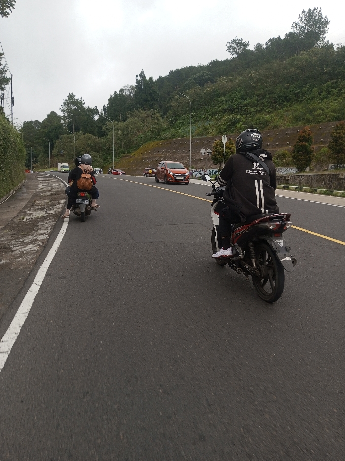 The image displays a multi-lane asphalt road scene under an overcast sky, located in Saing Ta Mawt Lay, Myanmar. The road features a solid white line marking the left shoulder and a dashed yellow line delineating lanes. Two motorcycles are present in the midground, traveling away from the viewer. The motorcycle on the left carries two individuals; the rear passenger wears a light brown backpack and dark clothing. The motorcycle on the right, positioned closer to the viewer and more centrally in the right lane, is operated by a single person wearing a black helmet, a black jacket with "3/4 DESIGN" written in white on the back, black pants, and white shoes. Further ahead on the road, an orange-red compact car is visible in the right lane, and a white van appears in the distant left lane. The left side of the road is bordered by a concrete curb and a wall covered in green ivy. To the right, a steep hillside densely covered with green trees and undergrowth rises, featuring visible concrete retaining wall sections. Streetlights are spaced along the road.