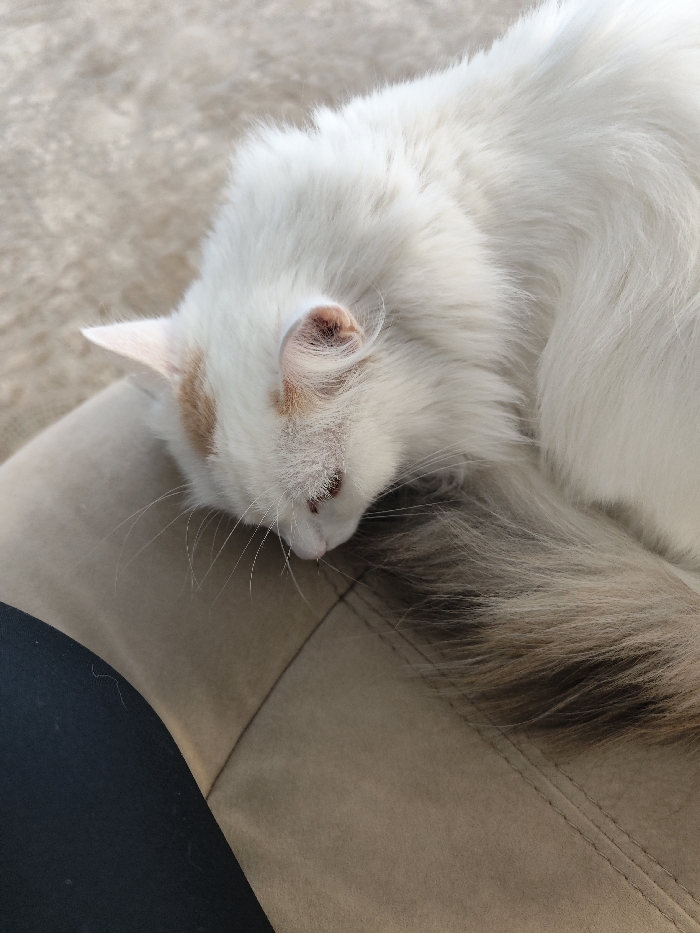 - "A white, long-haired domestic cat is depicted resting on a beige upholstered surface, likely a piece of furniture or a person's lap, in an indoor environment in the city of Unknown, Unknown" by FM-jysRZ2, licensed under CC BY 4.0