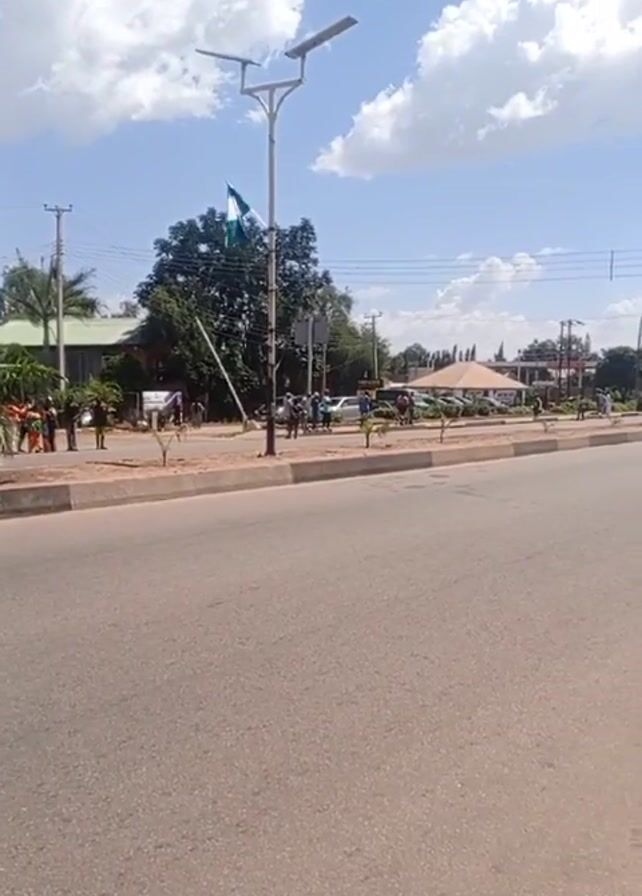 wide asphalt road in an urban setting. On the right side of the road, a raised curb separates the road from a landscaped area with small bushes and trees. A group of people, mostly dressed in dark clothing, are standing along the edge of the landscaped area. Further back, several cars are parked. The sky is blue with scattered white clouds. A tall solar-powered street light stands prominently on the left side of the road. A flag, possibly national or local, is attached to the streetlight. The sound of an emergency vehicle siren is audible.