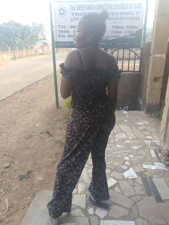 The image displays an outdoor scene in Jos, Nigeria, in front of THE REDEEMED CHRISTIAN CHURCH OF GOD TRINITY ASSEMBLY (ZONE HEADQUARTERS), as identified by a prominent white sign with black text listing church activities. A female subject is positioned in the foreground, viewed from behind and slightly to her left. She is standing on an irregularly tiled light-colored walkway, her head turned to the left, looking away from the camera. The subject is wearing a black off-shoulder jumpsuit with thin black straps, adorned with a multicolor floral pattern. Her dark hair is pulled up into a bun. She wears earrings and white and grey athletic shoes. To the immediate left of the walkway is an expanse of reddish-brown dirt containing scattered small stones and debris. Further left, a paved road is visible, with two distant figures, including a small child, discernible on its far side. Behind the subject and to her right, a dark metal gate with a curved upper section is present, adjacent to a light-colored concrete or stone pillar. The scene is illuminated by daylight.