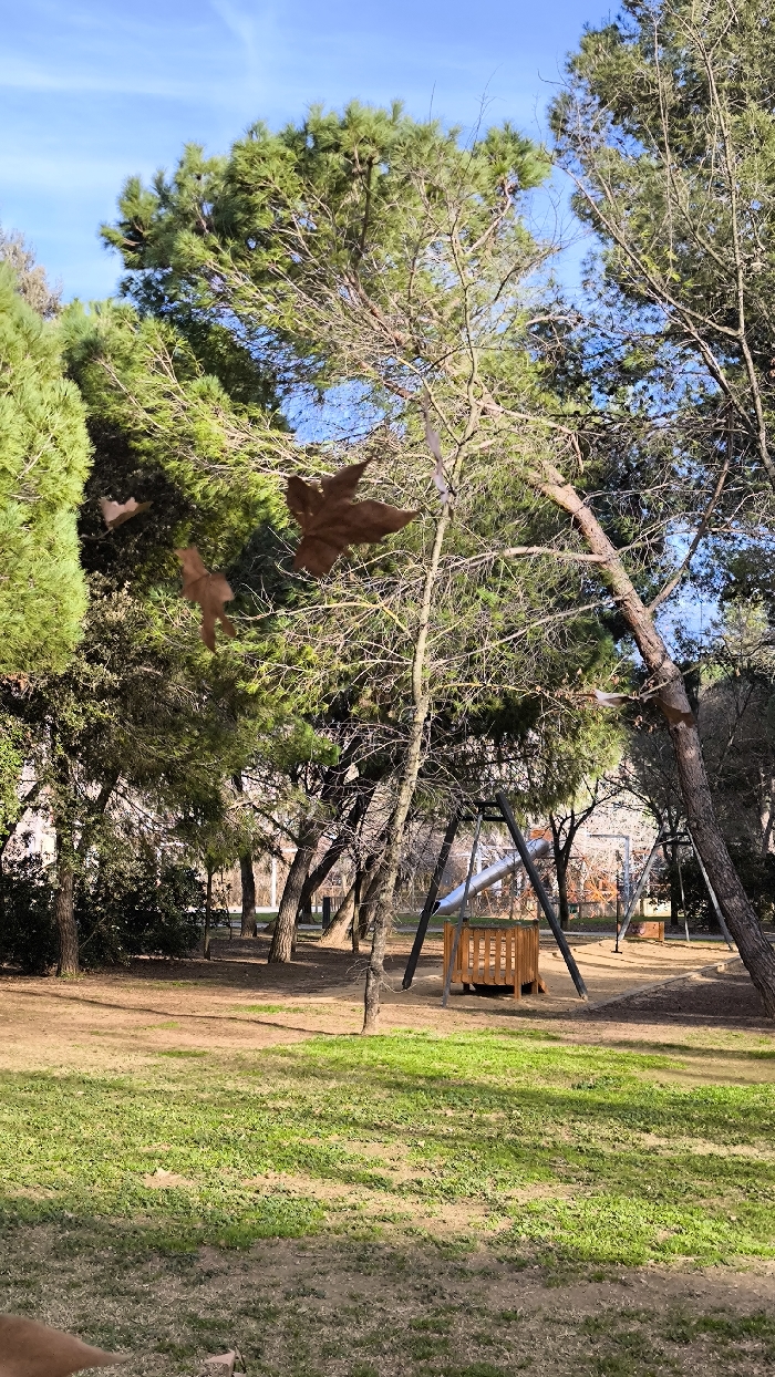 A park landscape displays vibrant greenery and tall trees. A brown, leaf-like filter overlays the image, accentuating the autumnal feel. A playground structure with a slide is visible amidst the trees, adding to the park setting. The sky is bright blue, providing a contrasting backdrop to the scene. The ground is covered in a mix of green grass and brown patches.