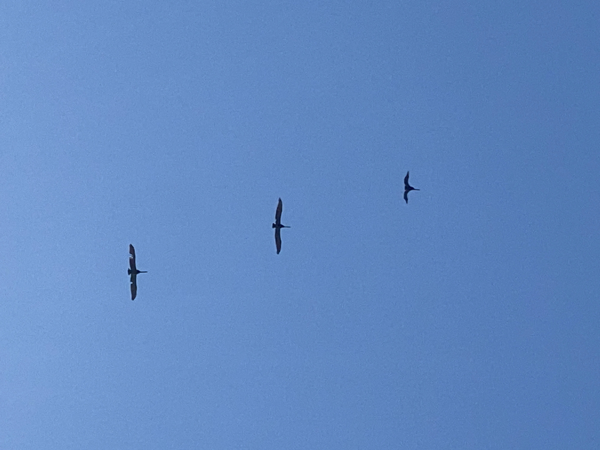 Three dark birds are flying in a clear, light blue sky