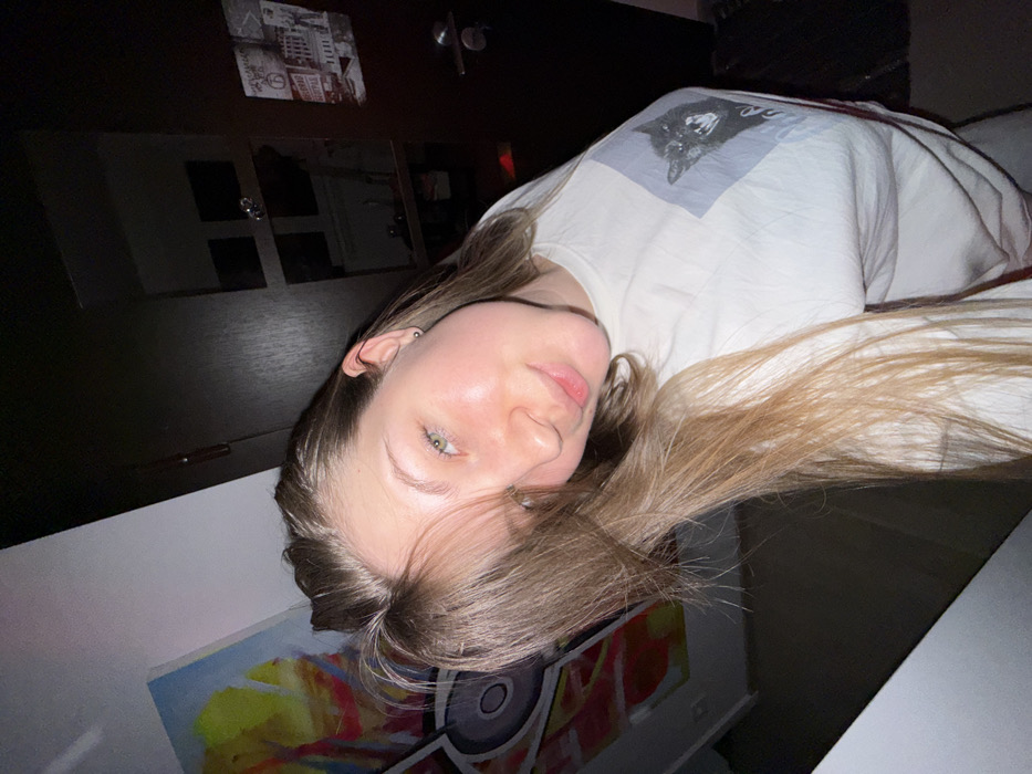 The scene depicts an indoor environment located in the city of Vozdovac Urban Municipality, Serbia. A female subject, identified by her light skin, long light-brown hair, and green eyes, is positioned in the foreground, facing the camera directly with a slight head tilt and a closed-lip smile. She wears a light-colored, long-sleeved shirt featuring a graphic print of a black cat with bared teeth, set within a light blue square. A small silver stud is visible in her left earlobe. To the subject's left, a white wall is visible, on which an abstract artwork with prominent yellow, orange, blue, and black elements is partially displayed. To the subject's right, a dark brown wooden door or wardrobe is present. Multiple papers or posters are affixed to its surface, including one depicting architectural structures and another featuring a peace symbol. A silver door handle is located on the lower right side of this door/wardrobe. The interior of the open door/wardrobe reveals dim shelving containing various indistinct objects. The lighting strongly illuminates the subject's face, casting portions of the background into shadow.