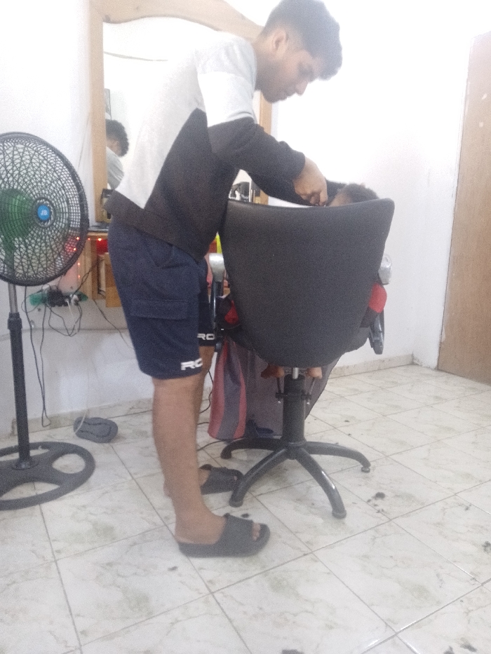 A man in a black and white sweater and blue shorts gives someone a haircut in a salon. The person receiving the haircut is sitting in a black salon chair. The floor is tiled, and there is a standing fan in the background. There is hair scattered on the floor around the chair. The man wears black sandals. A mirror is visible in the background.