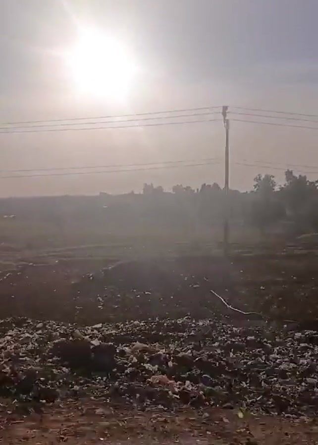 field in what appears to be a rural area on a bright day. The sun is high in the sky. The foreground is filled with debris and trash, with a distant view of a hazy field stretching towards the horizon. There are power lines running across the sky, and a few trees are visible in the distance. The landscape seems dry, with patches of vegetation. The camera seems to be moving, perhaps from a vehicle.