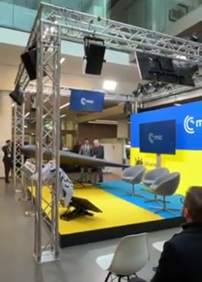 scene indoors at what appears to be a conference or a convention. Two men in suits are shaking hands near a table on a platform that is painted with blue and yellow, the colors of the Ukrainian flag. There are four gray chairs positioned near the back of the platform. Screens with the symbol of the Munich Security Conference (MSC) are visible behind the men. A drone is positioned on the table. The setting includes scaffolding, speakers, monitors, and a screen, likely for a presentation. There are a few people sitting in the foreground watching the men shake hands. There are people walking by in the background. The entire scene is well-lit.