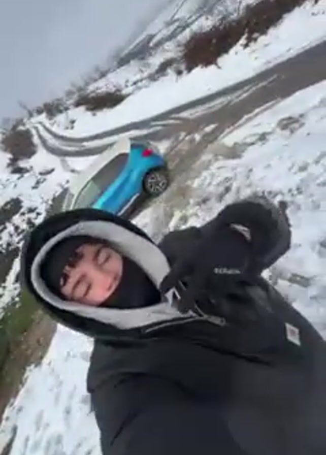 group of people in a snowy area. The scene starts with a person in a hooded jacket looking at the camera. The camera pans down to show two people emptying a white plastic bag filled with empty red Coca-Cola cans onto the snow-covered ground. The surrounding environment is a snowy landscape with some vegetation visible on a hillside. A blue car is seen parked on a nearby road. The focus of the video is on the action of scattering the cans in the snow.