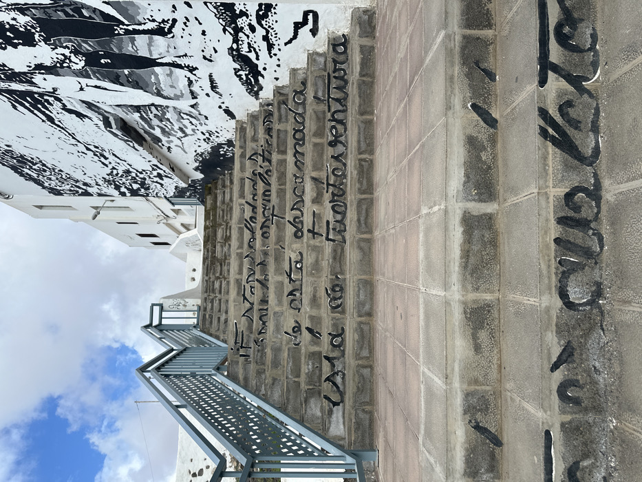 The image displays an outdoor concrete staircase ascending a hillside in Puerto del Rosario, Spain, under a partially cloudy sky. The staircase, constructed from light grey and brown block pavers, features dark grey metal railings with perforated panels on its left side, extending upwards and out of frame. Black handwritten script is painted across the risers, partially legible as "Si estás cansado y orgulloso de esta descarada vida en Fuerteventura" (If you are tired and proud of this shameless life in Fuerteventura). To the right of the stairs, a multi-story white building facade is adorned with a large black and white mural depicting stylized human legs and an abstract, textured background. A street light is mounted on the white building wall above the mural. The ground level in the foreground consists of square reddish-brown and grey paving tiles. No individuals are present in the scene.